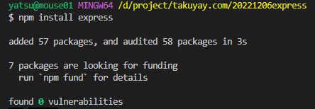 npm install expressVSCodeのターミナル欄ではこんな感じです。私はGit Bash使ってます。