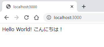 });これは、”/”すなわちルートディレクトリにアクセスしたら、”Hello World! こんにちは!”というテキストが送られるということを書いています。