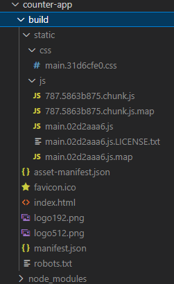 npm run build をターミナルで打ち込むと、数分後、HTMLやCSS、JavaScriptファイル等がbuildディレクトリの中に作られます。