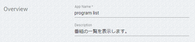 Overviewに、アプリの名前(App Name)を入力します。半角英数記号しか使えないようです。