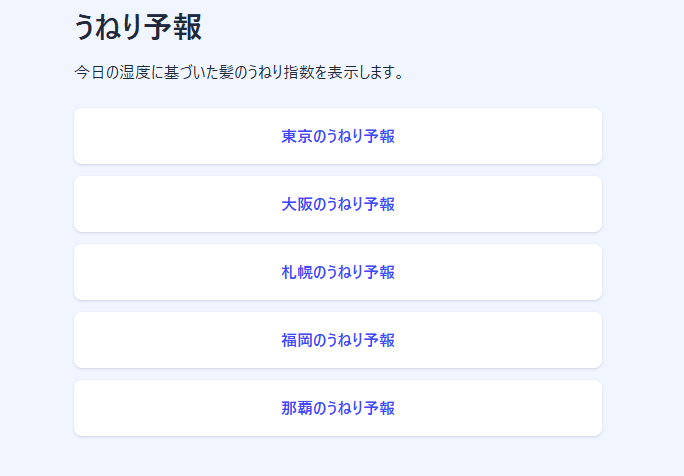 日本の主要都市の湿度から、髪のうねり具合を予測。東京・大阪・札幌・福岡・那覇など、毎日更新の簡単うねり予報!