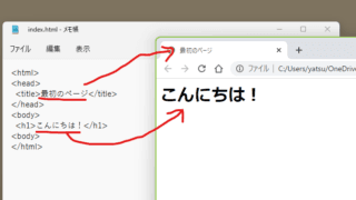 フロントエンドWebサイトに画像を表示する Webサイトに画像を表示するには<img>タグを使います。メモ帳でもできるんですが、コードを書くのに便利なテキストエディタを使ったほうが早いです。私はVisual Studio Codeを使用しています。よくVSCodeと略されます。日本語... 2022.12.01フロントエンド